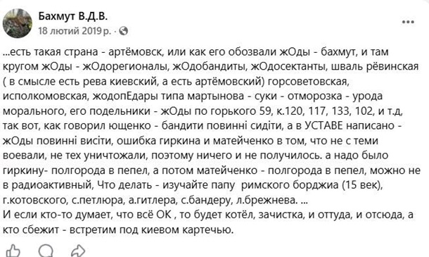 Світогляд ненависті: Його соцмережі — це звалище антисемітизму, фашизму та зневаги до України. Він відкрито захоплювався Гітлером та жалкував, що Гіркін не знищив Бахмут повністю у 2014-му.